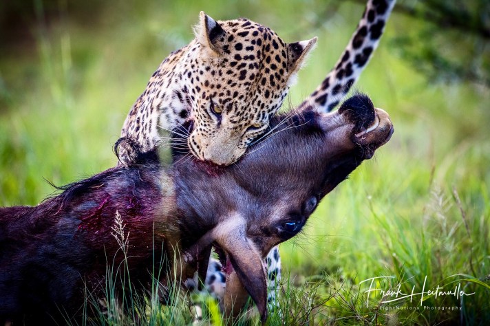 Speaking to some voluntary rangers during the first sighting, we had found out his name was Orion, he had just left his mother and was looking for his own territory and hence his willingness to be seen. He was also clearly very hungry and did not care to hide while he hunted. We later heard and saw that after we had left him the first time he had reappeared near the kill and used the cars as camouflage to hunt down the Wildebeest. Apparently he was still there the next morning, having successfully eaten his share and having fought off the Brown Hyenas overnight. By mid morning the bush clean-up crew had been there and no evidence of the day before existed, except for our memories and the photos we took.