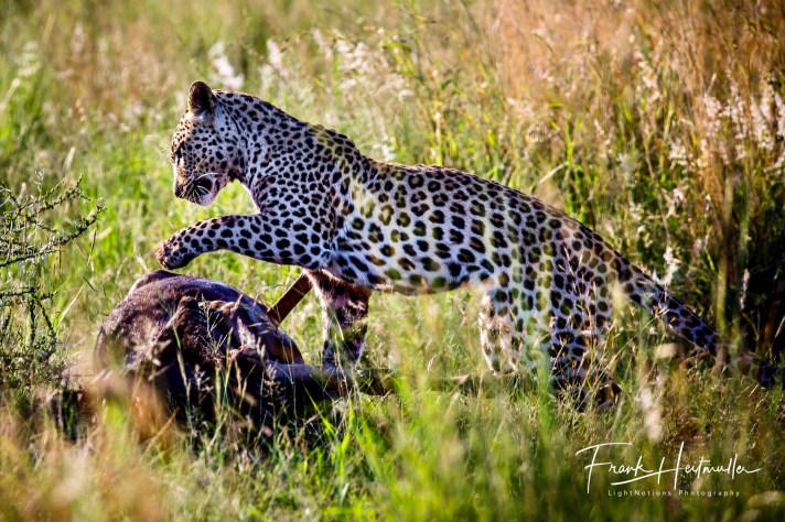 In relation to the Leopard, it was a large one and Orion had to hold on for dear life. With his grip on its throat he did not let go until the job was done. He then proceeded to try and pull it to some sort of cover, managing just a couple meters at a time, before having to take a rest again. Nervously scanning the bush around him as he drags, bites and rests, he needed to be so careful that he would not lose his hard fought-for dinner to the larger predators in the area.