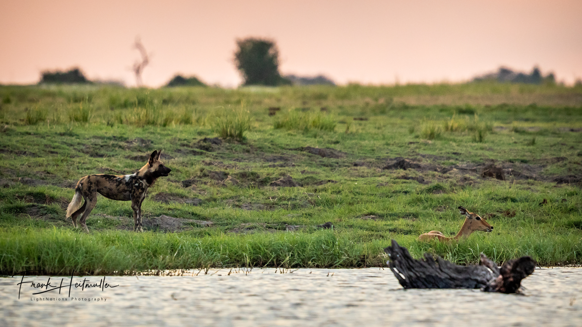 Dogs… Dogs…. came the siren like call from the back of the boat. We had had a quiet afternoon on the river and with the sun, just about preparing to set, we were busy exploring the different settings of our cameras when Killer, our apply named guide on the river that afternoon, bellowed again… Dogs.. Dogs… We swiveled in our chairs to see 4 of the African Painted Wolves appear from the tree line on the edge of Puku flats in the Chobe Reserve… and thus the story began….