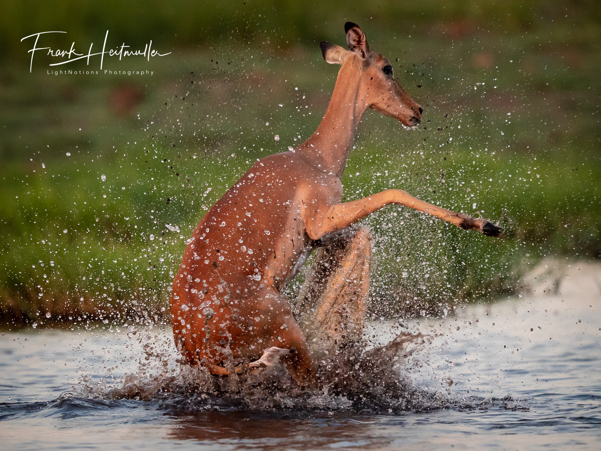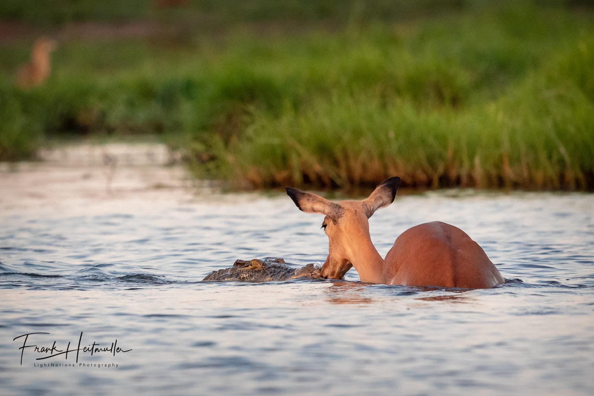 An Impala shot out into the air, a croc in full attack underneath it, but as luck would have it, it missed and the impala was swimming again, straight back at us, those wide eyes screaming for help, with two crocodiles in hot pursuit.