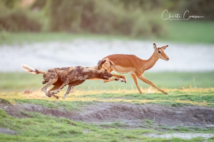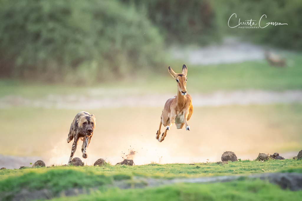 Alarm calls echoed across the flats, Impala running in all directions as the dogs got between them and the ensuing chaos unfolded. Shutters rattling through the air like machine guns focused at the enemy lines of an full frontal attack. Animals exploding in all directions with wild dogs in pursuit. A giraffe hurtled off into the trees with dog hot on its heals… one of those what was he thinking, kind of moments. Impala pronking almost doing handstands trying to draw attention away from the others when there it was, that once in a life time moment of an Impala ewe in full flight coming right at us with a dog in hot pursuit. Hearts pounding, fingers stuck on the the shutter and settings… well mine were set for panning while Christa’s were close enough to catch that moment, that moment, that is the cover image of this story.